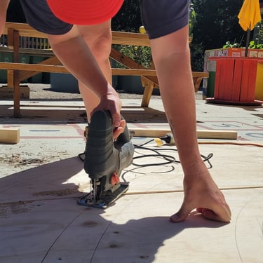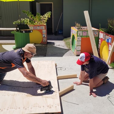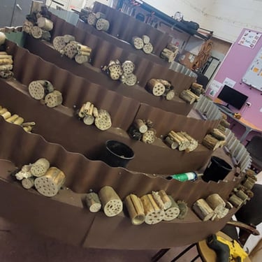 The sub-structure is supported with a frame just like under your floor at home. Layers of thick plywood were then added and thin plywood and corrugated iron were added to the fronts to support the insect hotels.