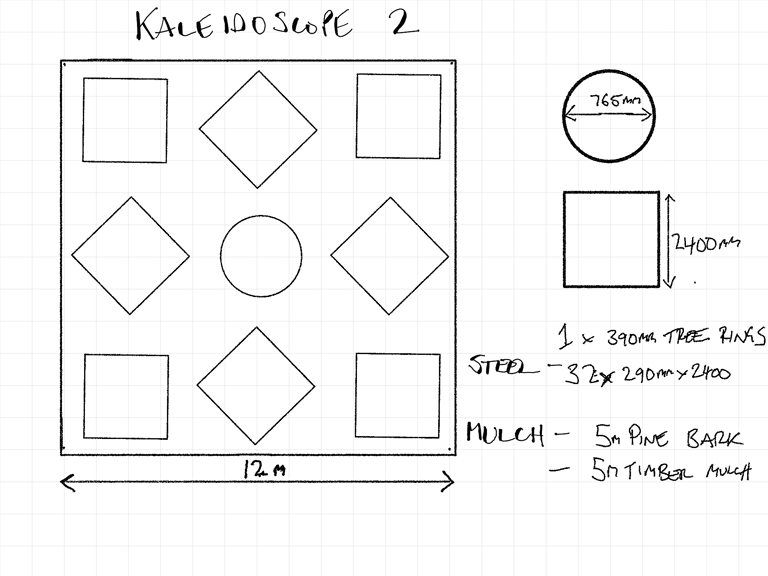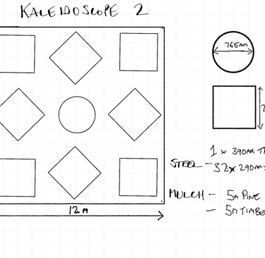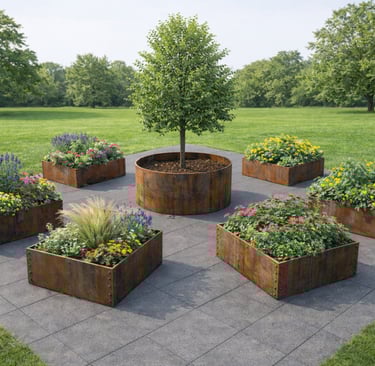 The concept is beautifully simple yet profoundly impactful: nine striking corten steel planters arranged in a geometric kaleidoscope pattern (four diamond shapes, four square planters, and one circular centrepiece) become a canvas for daily creativity and connection.